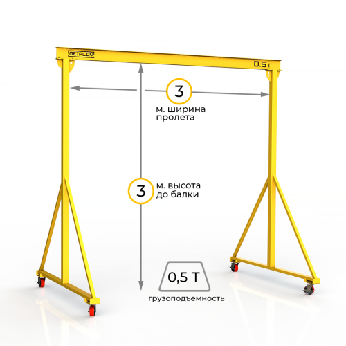 Мини-кран козловой мобильный (МПУ) грузоподъемностью до 500 килограмм, с высотой до балки 3 метра и шириной пролета 3 метра, это подъемное устройство, предназначенное для подъема и перемещения различных грузов на небольшие расстояния. Кран адаптирован для складских и производственных помещений, также может быть использован и на улице.