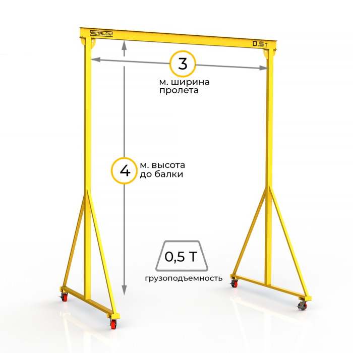 Мини-кран козловой мобильный (МПУ) грузоподъемностью до 500 килограмм, с высотой до балки 4 метра и шириной пролета 3 метра, это подъемное устройство, предназначенное для подъема и перемещения различных грузов на небольшие расстояния. Кран адаптирован для складских и производственных помещений, также может быть использован и на улице.