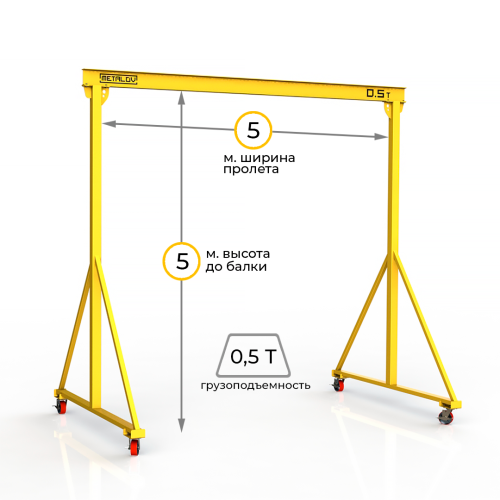 Мини-кран козловой мобильный (МПУ) грузоподъемностью до 500 килограмм, с высотой до балки 5 метров и шириной пролета 5 метров, это подъемное устройство, предназначенное для подъема и перемещения различных грузов на небольшие расстояния. Кран адаптирован для складских и производственных помещений, также может быть использован и на улице.