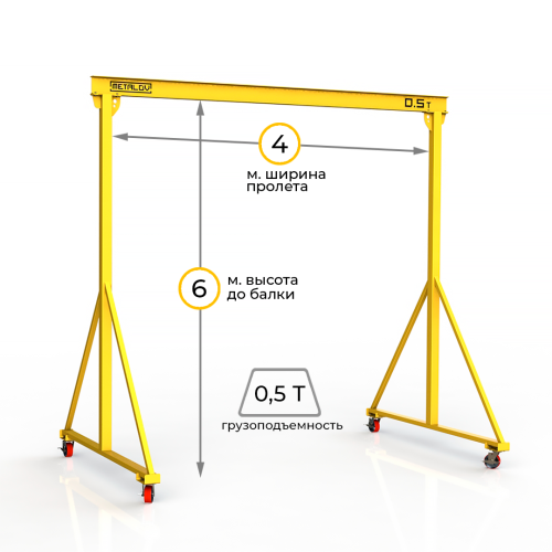 Мини-кран козловой мобильный (МПУ) грузоподъемностью до 500 килограмм, с высотой до балки 6 метров и шириной пролета 4 метра, это подъемное устройство, предназначенное для подъема и перемещения различных грузов на небольшие расстояния. Кран адаптирован для складских и производственных помещений, также может быть использован и на улице.
