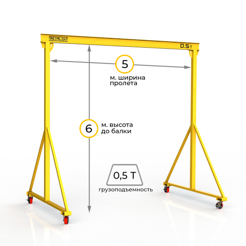 Мини-кран козловой мобильный (МПУ) грузоподъемностью до 500 килограмм, с высотой до балки 6 метров и шириной пролета 5 метров, это подъемное устройство, предназначенное для подъема и перемещения различных грузов на небольшие расстояния. Кран адаптирован для складских и производственных помещений, также может быть использован и на улице.