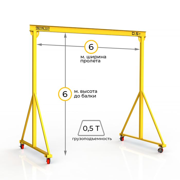 Мини-кран козловой мобильный (МПУ) грузоподъемностью до 500 килограмм, с высотой до балки 6 метров и шириной пролета 6 метров, это подъемное устройство, предназначенное для подъема и перемещения различных грузов на небольшие расстояния. Кран адаптирован для складских и производственных помещений, также может быть использован и на улице.