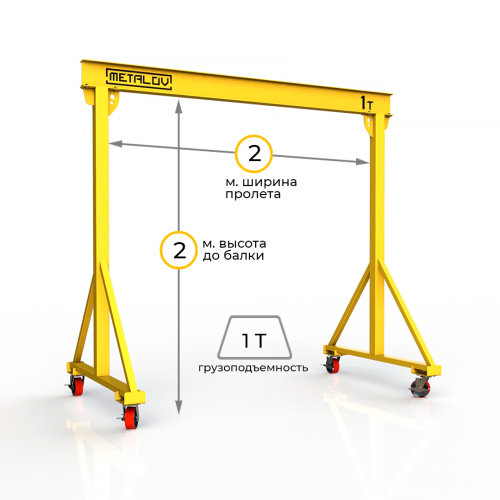 Мини-кран козловой мобильный (МПУ) грузоподъемностью до 1 тонны, с высотой до балки 2 метра и шириной пролета 2 метра, это подъемное устройство, предназначенное для подъема и перемещения различных грузов на небольшие расстояния. Кран адаптирован для складских и производственных помещений, также может быть использован и на улице.