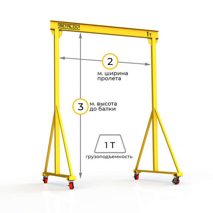 Мини-кран козловой мобильный (МПУ) грузоподъемностью до 1 тонны, с высотой до балки 3 метра и шириной пролета 2 метра, это подъемное устройство, предназначенное для подъема и перемещения различных грузов на небольшие расстояния. Кран адаптирован для складских и производственных помещений, также может быть использован и на улице.