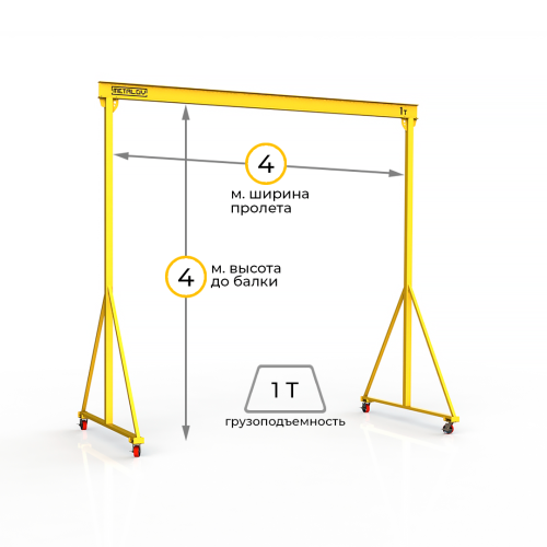 Мини-кран козловой мобильный (МПУ) грузоподъемностью до 1 тонны, с высотой до балки 4 метра и шириной пролета 4 метра, это подъемное устройство, предназначенное для подъема и перемещения различных грузов на небольшие расстояния. Кран адаптирован для складских и производственных помещений, также может быть использован и на улице.