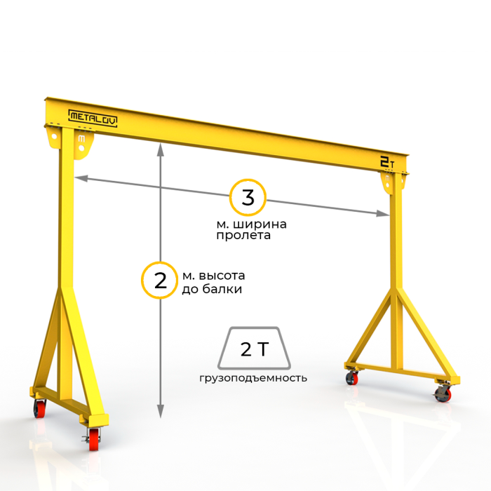 Мини-кран козловой мобильный (МПУ) грузоподъемностью до 2 тонн, с высотой до балки 2 метра и шириной пролета 3 метра, это подъемное устройство, предназначенное для подъема и перемещения различных грузов на небольшие расстояния. Кран адаптирован для складских и производственных помещений, также может быть использован и на улице.