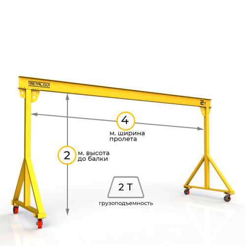 Мини-кран козловой мобильный (МПУ) грузоподъемностью до 2 тонн, с высотой до балки 2 метра и шириной пролета 4 метра, это подъемное устройство, предназначенное для подъема и перемещения различных грузов на небольшие расстояния. Кран адаптирован для складских и производственных помещений, также может быть использован и на улице.