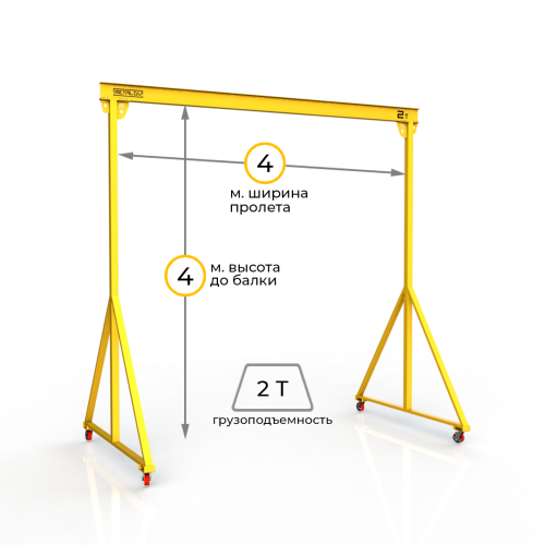 Мини-кран козловой мобильный (МПУ) грузоподъемностью до 2 тонн, с высотой до балки 4 метра и шириной пролета 4 метра, это подъемное устройство, предназначенное для подъема и перемещения различных грузов на небольшие расстояния. Кран адаптирован для складских и производственных помещений, также может быть использован и на улице.