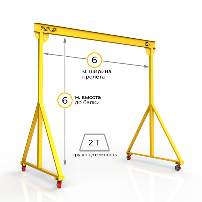 Мини-кран козловой мобильный (МПУ) грузоподъемностью до 2 тонн, с высотой до балки 6 метров и шириной пролета 6 метров, это подъемное устройство, предназначенное для подъема и перемещения различных грузов на небольшие расстояния. Кран адаптирован для складских и производственных помещений, также может быть использован и на улице.