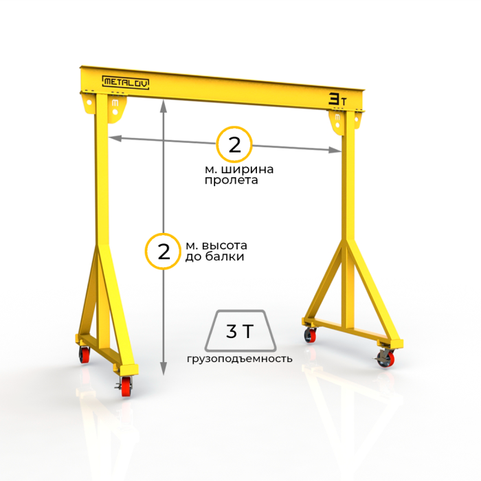 Мини-кран козловой мобильный (МПУ) грузоподъемностью до 3 тонн, с высотой до балки 2 метра и шириной пролета 2 метра, это подъемное устройство, предназначенное для подъема и перемещения различных грузов на небольшие расстояния. Кран адаптирован для складских и производственных помещений, также может быть использован и на улице.