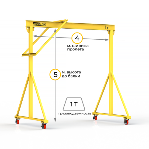 Мини-кран козловой мобильный ручной (МПУ) усиленной конструкции с раскосами Мобиус-R1 с грузоподъемностью до 1 тонны, с высотой до балки 5 метров и шириной пролета 4 метра, это компактное устройство, для подъема и перемещения грузов на небольшие расстояния. Кран адаптирован для работы в помещениях, и может быть использован на улице.