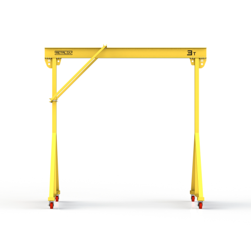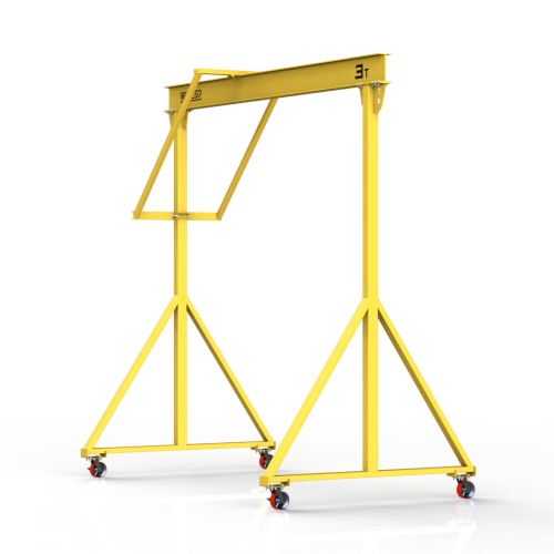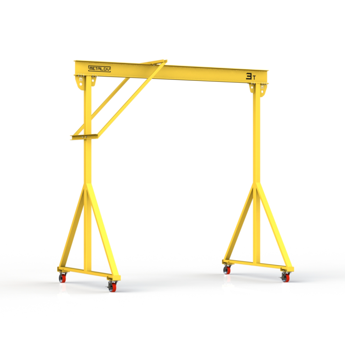 Мини-кран козловой мобильный ручной (МПУ) усиленной конструкции с раскосами Мобиус-R1 с грузоподъемностью до 3 тонн, с высотой до балки 3 метра и шириной пролета 2 метра, это компактное устройство, для подъема и перемещения грузов на небольшие расстояния. Кран адаптирован для работы в помещениях, и может быть использован на улице.