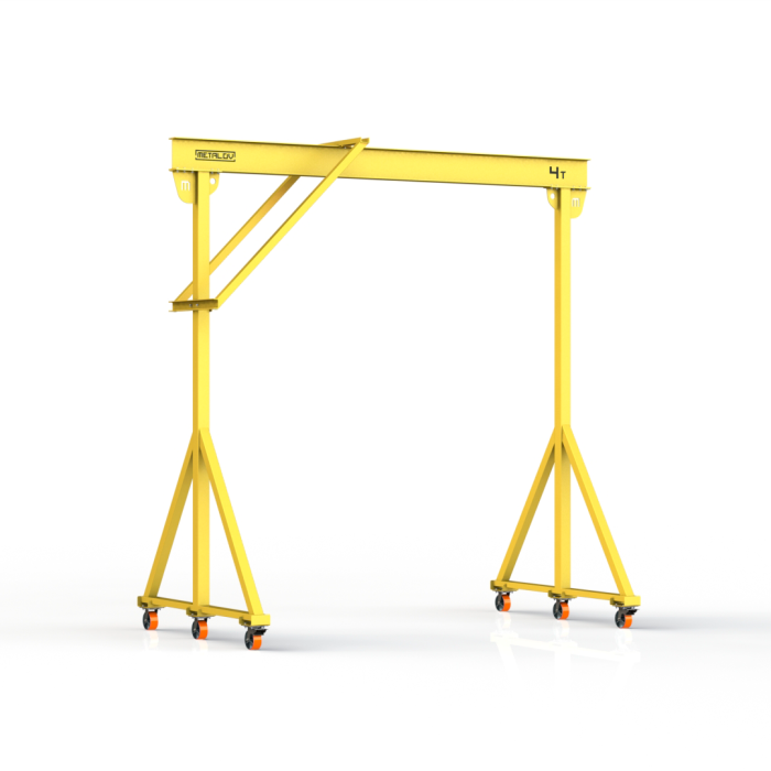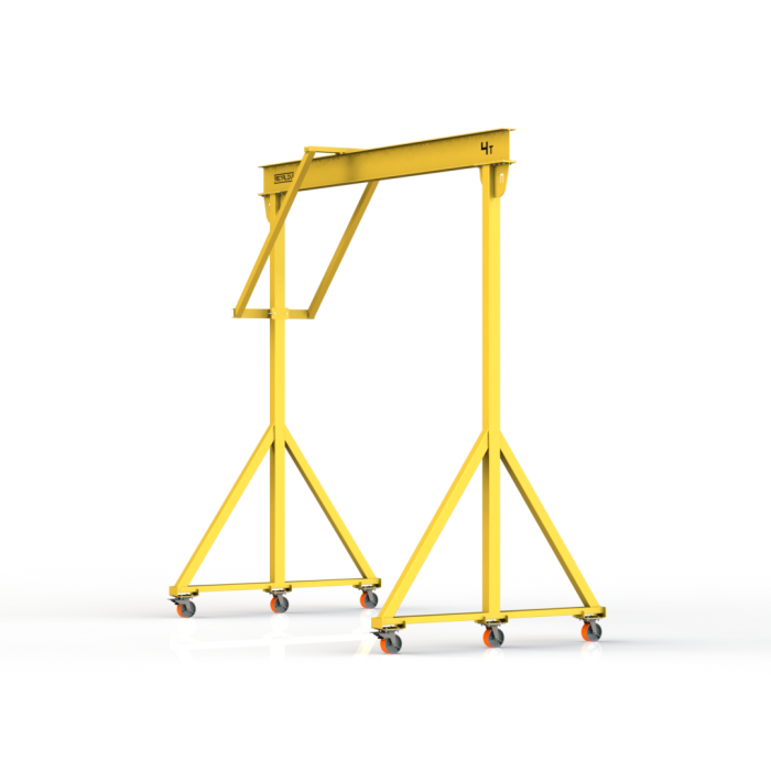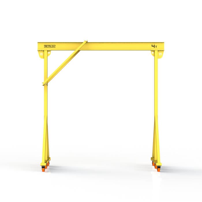 Мини-кран козловой мобильный ручной (МПУ) усиленной конструкции с раскосами Мобиус-R1 с грузоподъемностью до 4 тонн, с высотой до балки 6 метров и шириной пролета 5 метров, это компактное устройство, для подъема и перемещения грузов на небольшие расстояния. Кран адаптирован для работы в помещениях, и может быть использован на улице.