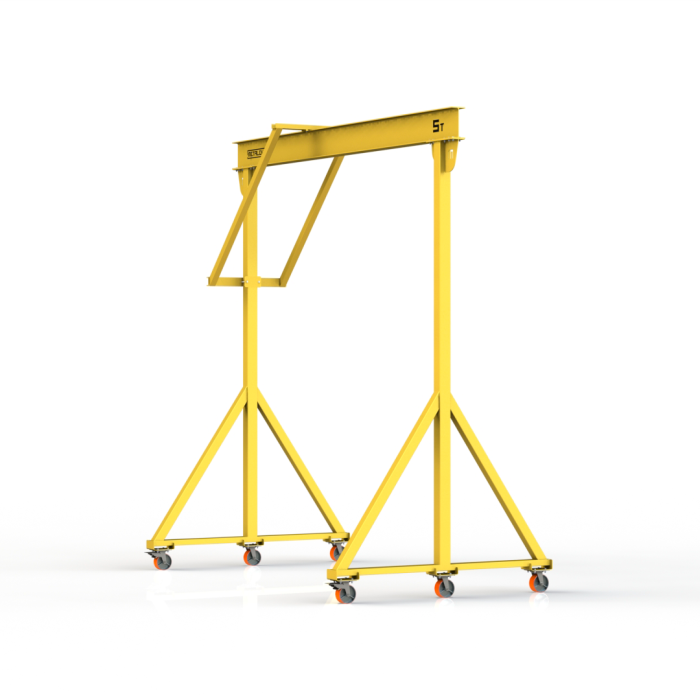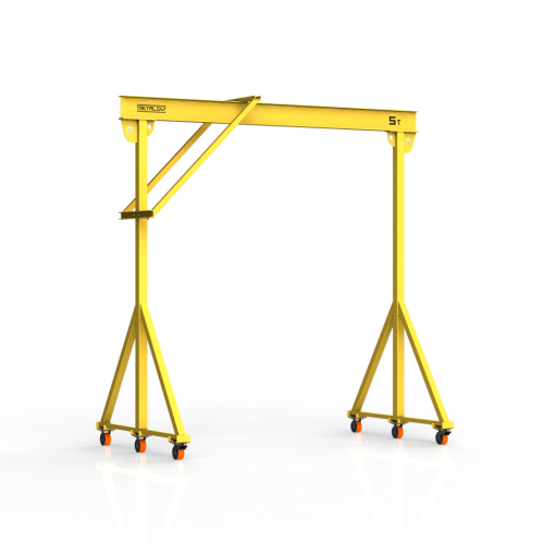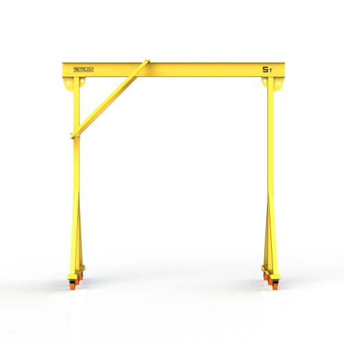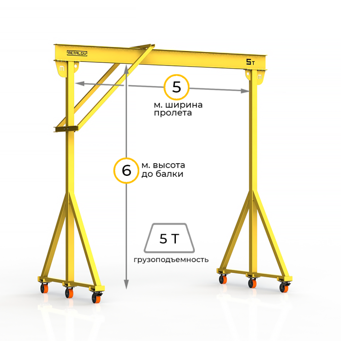 Мини-кран козловой мобильный ручной (МПУ) усиленной конструкции с раскосами Мобиус-R1 с грузоподъемностью до 5 тонн, с высотой до балки 6 метров и шириной пролета 5 метров, это компактное устройство, для подъема и перемещения грузов на небольшие расстояния. Кран адаптирован для работы в помещениях, и может быть использован на улице.