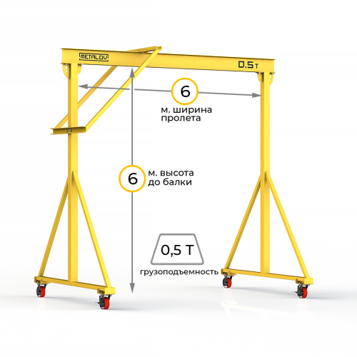 Мини-кран козловой мобильный ручной (МПУ) усиленной конструкции с раскосами Мобиус-R1 с грузоподъемностью до 500 килограмм, с высотой до балки 6 метров и шириной пролета 6 метров, это компактное устройство, для подъема и перемещения грузов на небольшие расстояния. Кран адаптирован для работы в помещениях, и может быть использован на улице.