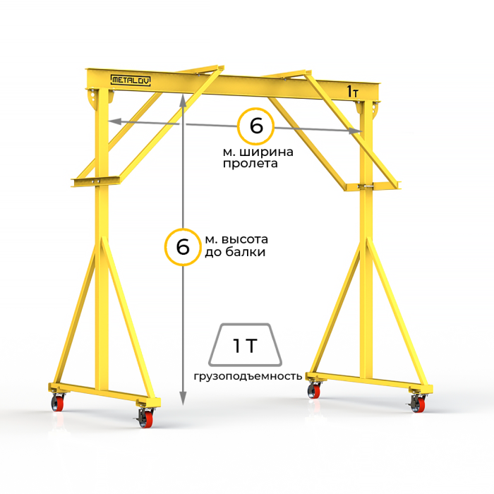 Мини-кран козловой мобильный ручной (МПУ) усиленной конструкции с раскосами Мобиус-R2 с грузоподъемностью до 1 тонны, с высотой до балки 6 метров и шириной пролета 6 метров, это компактное устройство, для подъема и перемещения грузов на небольшие расстояния. Кран адаптирован для работы в помещениях, и может быть использован на улице.