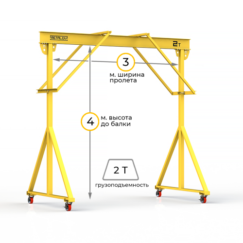Мини-кран козловой мобильный ручной (МПУ) усиленной конструкции с раскосами Мобиус-R2 с грузоподъемностью до 2 тонн, с высотой до балки 4 метра и шириной пролета 3 метра, это компактное устройство, для подъема и перемещения грузов на небольшие расстояния. Кран адаптирован для работы в помещениях, и может быть использован на улице.