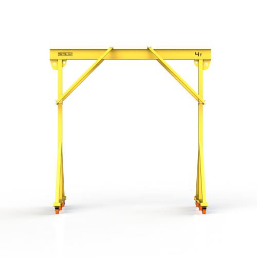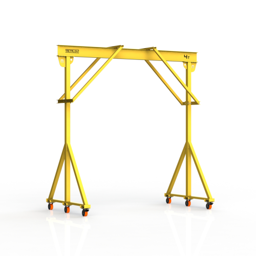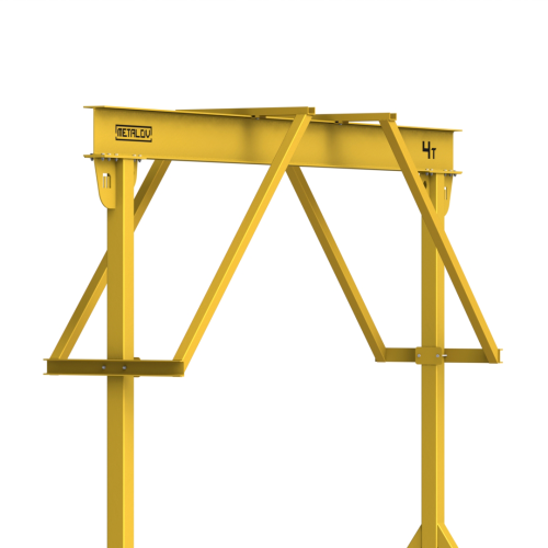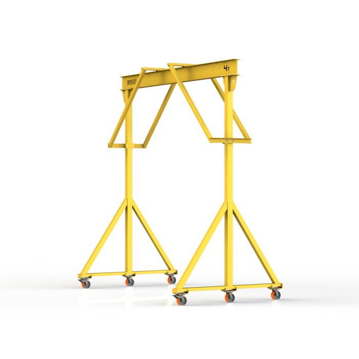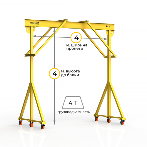 Мини-кран козловой мобильный ручной (МПУ) усиленной конструкции с раскосами Мобиус-R2 с грузоподъемностью до 4 тонн, с высотой до балки 4 метра и шириной пролета 4 метра, это компактное устройство, для подъема и перемещения грузов на небольшие расстояния. Кран адаптирован для работы в помещениях, и может быть использован на улице.