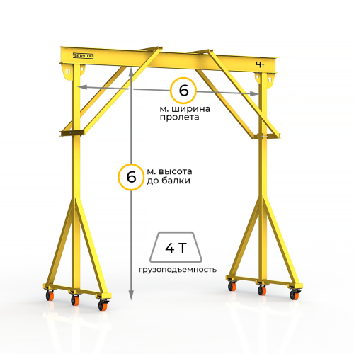 Мини-кран козловой мобильный ручной (МПУ) усиленной конструкции с раскосами Мобиус-R2 с грузоподъемностью до 4 тонн, с высотой до балки 6 метров и шириной пролета 6 метров, это компактное устройство, для подъема и перемещения грузов на небольшие расстояния. Кран адаптирован для работы в помещениях, и может быть использован на улице.