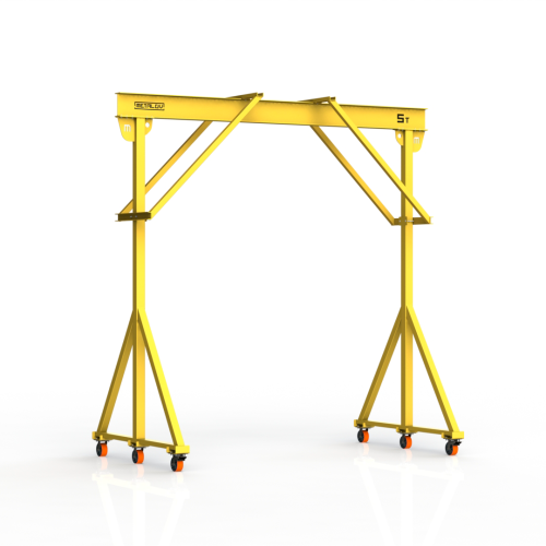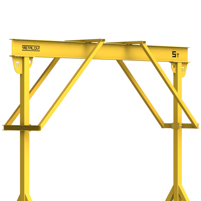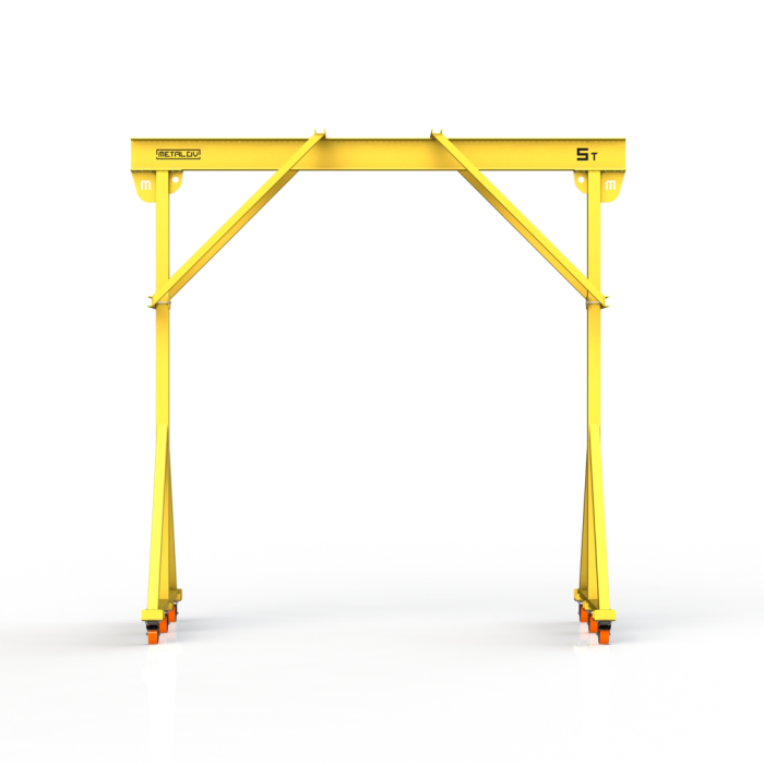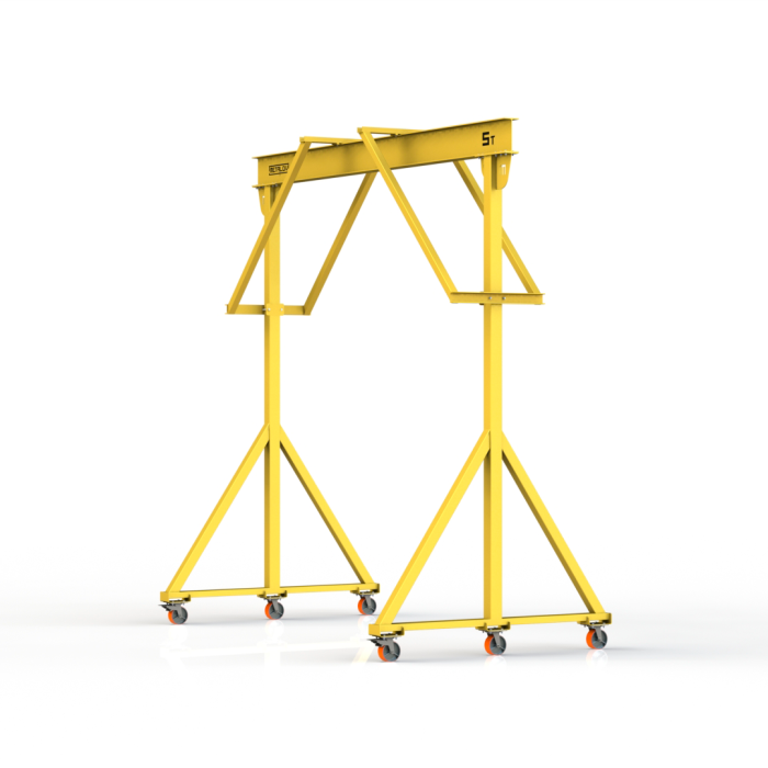 Мини-кран козловой мобильный ручной (МПУ) усиленной конструкции с раскосами Мобиус-R2 с грузоподъемностью до 5 тонн, с высотой до балки 4 метра и шириной пролета 5 метров, это компактное устройство, для подъема и перемещения грузов на небольшие расстояния. Кран адаптирован для работы в помещениях, и может быть использован на улице.