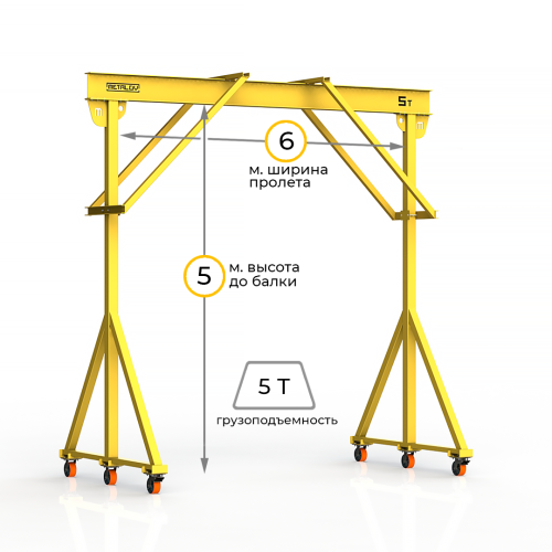 Мини-кран козловой мобильный ручной (МПУ) усиленной конструкции с раскосами Мобиус-R2 с грузоподъемностью до 5 тонн, с высотой до балки 5 метров и шириной пролета 6 метров, это компактное устройство, для подъема и перемещения грузов на небольшие расстояния. Кран адаптирован для работы в помещениях, и может быть использован на улице.