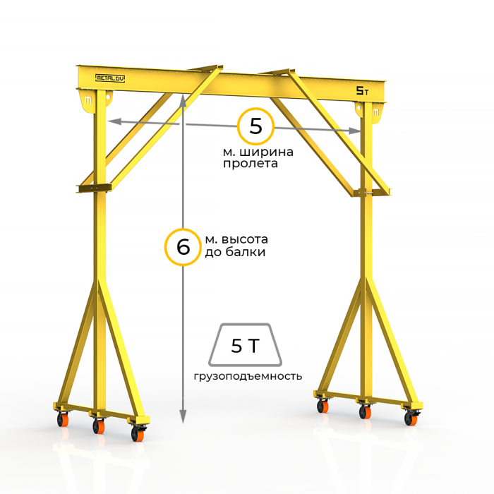 Мини-кран козловой мобильный ручной (МПУ) усиленной конструкции с раскосами Мобиус-R2 с грузоподъемностью до 5 тонн, с высотой до балки 6 метров и шириной пролета 5 метров, это компактное устройство, для подъема и перемещения грузов на небольшие расстояния. Кран адаптирован для работы в помещениях, и может быть использован на улице.