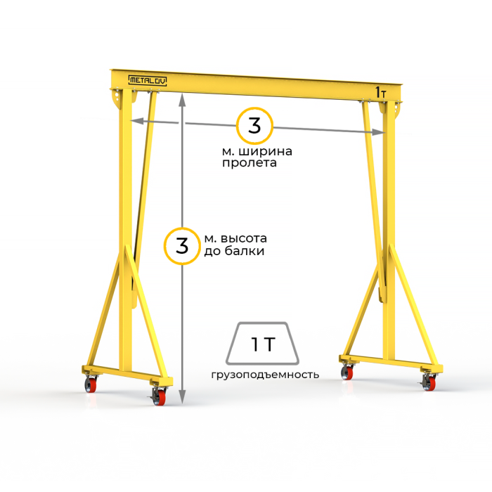 Мини-кран козловой мобильный (МПУ) усиленной конструкции Мобиус-V с грузоподъемностью до 1 тонны, с высотой до балки 3 метра и шириной пролета 3 метра, это компактное устройство, для подъема и перемещения грузов на небольшие расстояния. Кран адаптирован для работы в помещениях, и может быть использован на улице.