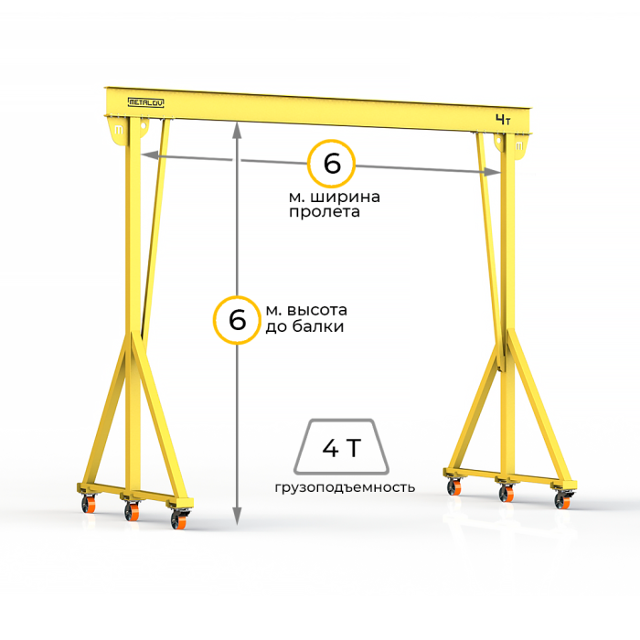 Мини-кран козловой мобильный (МПУ) усиленной конструкции Мобиус-V с грузоподъемностью до 4 тонн, с высотой до балки 6 метров и шириной пролета 6 метров, это компактное устройство, для подъема и перемещения грузов на небольшие расстояния. Кран адаптирован для работы в помещениях, и может быть использован на улице.