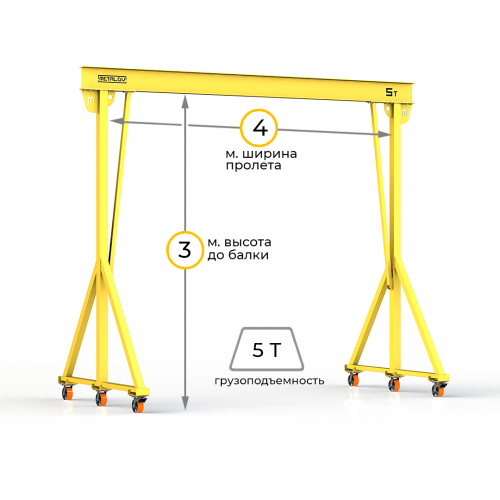 Мини-кран козловой мобильный (МПУ) усиленной конструкции Мобиус-V с грузоподъемностью до 5 тонн, с высотой до балки 3 метра и шириной пролета 4 метра, это компактное устройство, для подъема и перемещения грузов на небольшие расстояния. Кран адаптирован для работы в помещениях, и может быть использован на улице.