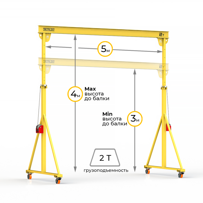 Мини козловой кран мобильный ручной (МПУ) с регулируемой высотой до балки Мобиус-TU имеет грузоподъемность до 2 тонн, минимальная высота составляет 3 метра, максимальная 4 метра. Ширина пролета 5 метров. Кран оборудован телескопическими опорами, высота которых регулируется с шагом в 250 мм, телескопические опоры выдвигаются при помощи ручной лебедки.