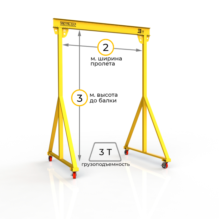 Мини-кран козловой мобильный (МПУ) грузоподъемностью до 3 тонн, с высотой до балки 3 метра и шириной пролета 2 метра, это подъемное устройство, предназначенное для подъема и перемещения различных грузов на небольшие расстояния. Кран адаптирован для складских и производственных помещений, также может быть использован и на улице.