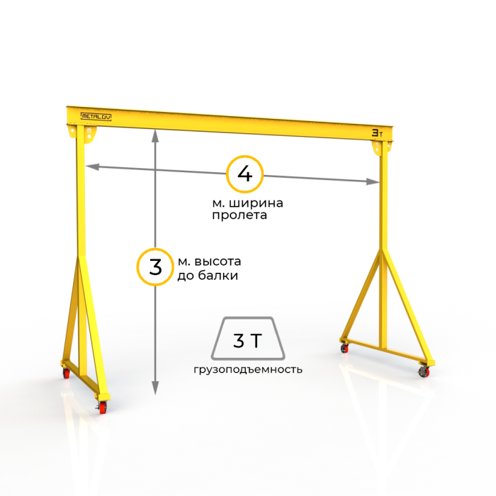 Мини-кран козловой мобильный (МПУ) грузоподъемностью до 3 тонн, с высотой до балки 3 метра и шириной пролета 4 метра, это подъемное устройство, предназначенное для подъема и перемещения различных грузов на небольшие расстояния. Кран адаптирован для складских и производственных помещений, также может быть использован и на улице.