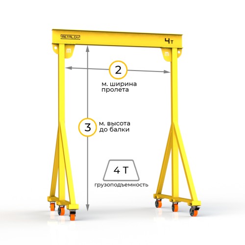Мини-кран козловой мобильный (МПУ) грузоподъемностью до 4 тонн, с высотой до балки 3 метра и шириной пролета 2 метра, это подъемное устройство, предназначенное для подъема и перемещения различных грузов на небольшие расстояния. Кран адаптирован для складских и производственных помещений, также может быть использован и на улице.