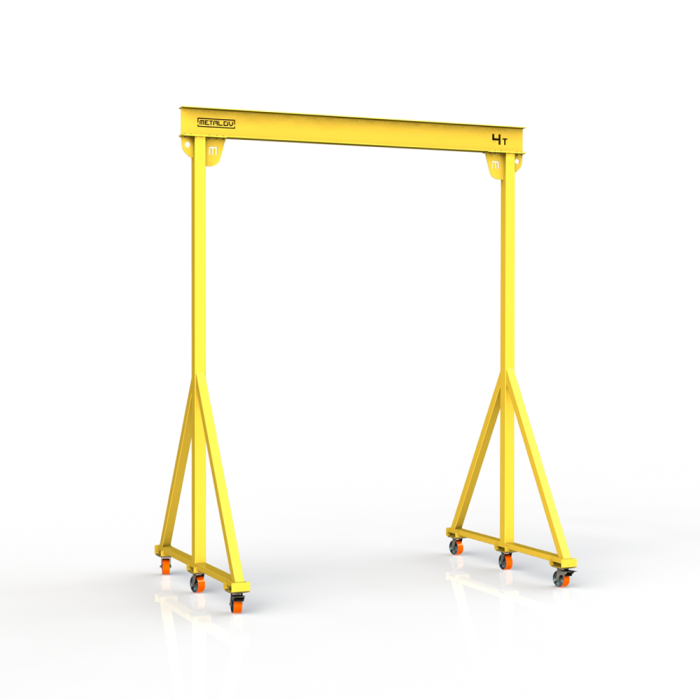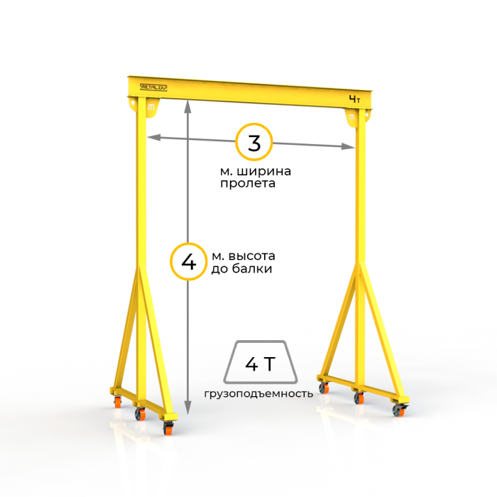 Мини-кран козловой мобильный (МПУ) грузоподъемностью до 4 тонн, с высотой до балки 4 метра и шириной пролета 3 метра, это подъемное устройство, предназначенное для подъема и перемещения различных грузов на небольшие расстояния. Кран адаптирован для складских и производственных помещений, также может быть использован и на улице.