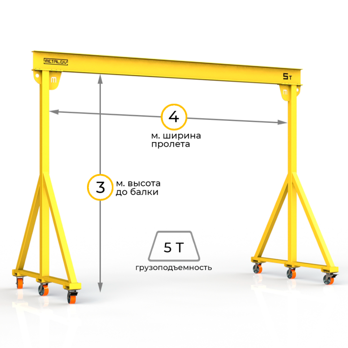 Мини-кран козловой мобильный (МПУ) грузоподъемностью до 5 тонн, с высотой до балки 3 метра и шириной пролета 4 метра, это подъемное устройство, предназначенное для подъема и перемещения различных грузов на небольшие расстояния. Кран адаптирован для складских и производственных помещений, также может быть использован и на улице.