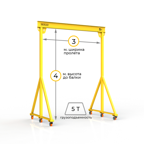 Мини-кран козловой мобильный (МПУ) грузоподъемностью до 5 тонн, с высотой до балки 4 метра и шириной пролета 3 метра, это подъемное устройство, предназначенное для подъема и перемещения различных грузов на небольшие расстояния. Кран адаптирован для складских и производственных помещений, также может быть использован и на улице.