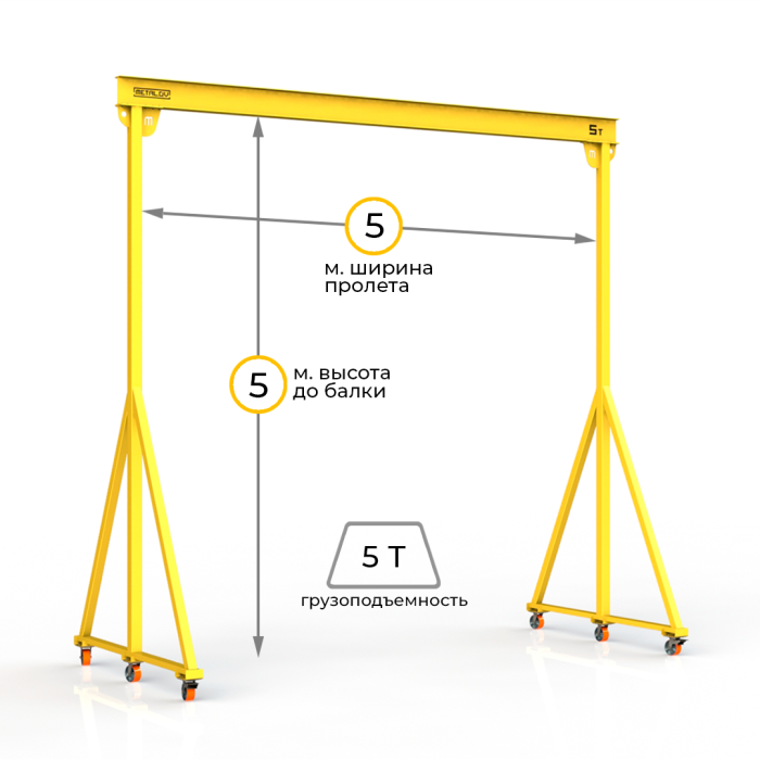 Мини-кран козловой мобильный (МПУ) грузоподъемностью до 5 тонн, с высотой до балки 5 метров и шириной пролета 5 метров, это подъемное устройство, предназначенное для подъема и перемещения различных грузов на небольшие расстояния. Кран адаптирован для складских и производственных помещений, также может быть использован и на улице.