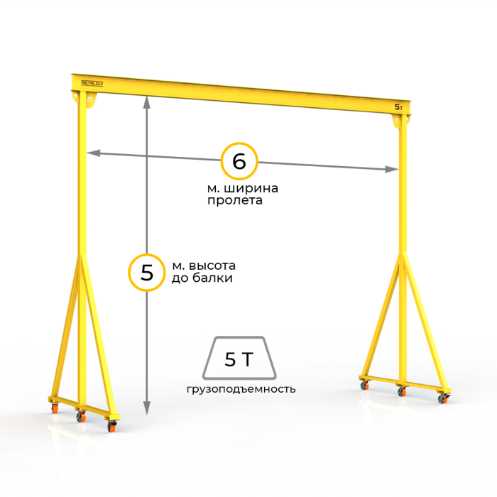 Мини-кран козловой мобильный (МПУ) грузоподъемностью до 5 тонн, с высотой до балки 5 метров и шириной пролета 6 метров, это подъемное устройство, предназначенное для подъема и перемещения различных грузов на небольшие расстояния. Кран адаптирован для складских и производственных помещений, также может быть использован и на улице.