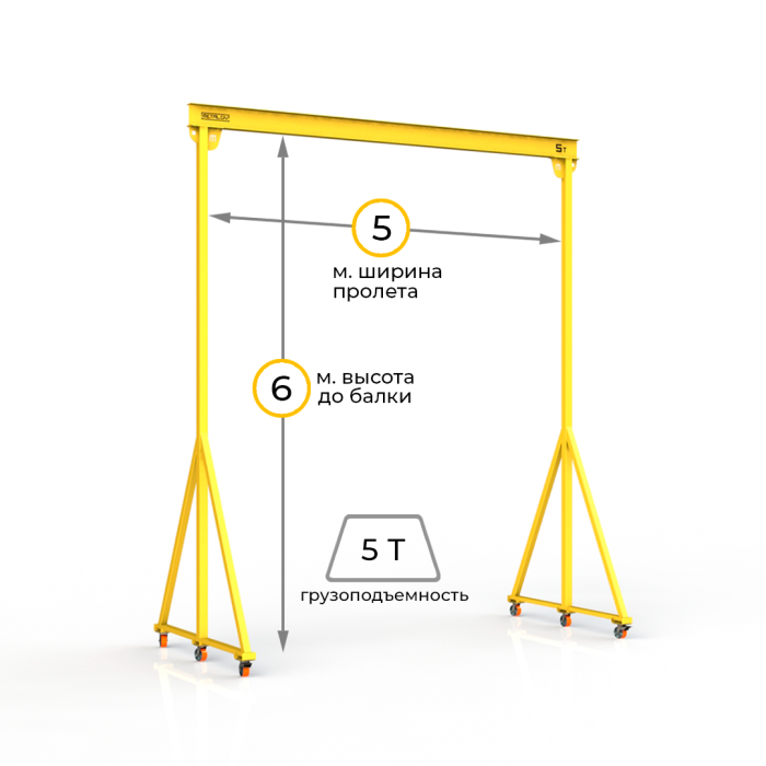 Мини-кран козловой мобильный (МПУ) грузоподъемностью до 5 тонн, с высотой до балки 6 метров и шириной пролета 5 метров, это подъемное устройство, предназначенное для подъема и перемещения различных грузов на небольшие расстояния. Кран адаптирован для складских и производственных помещений, также может быть использован и на улице.