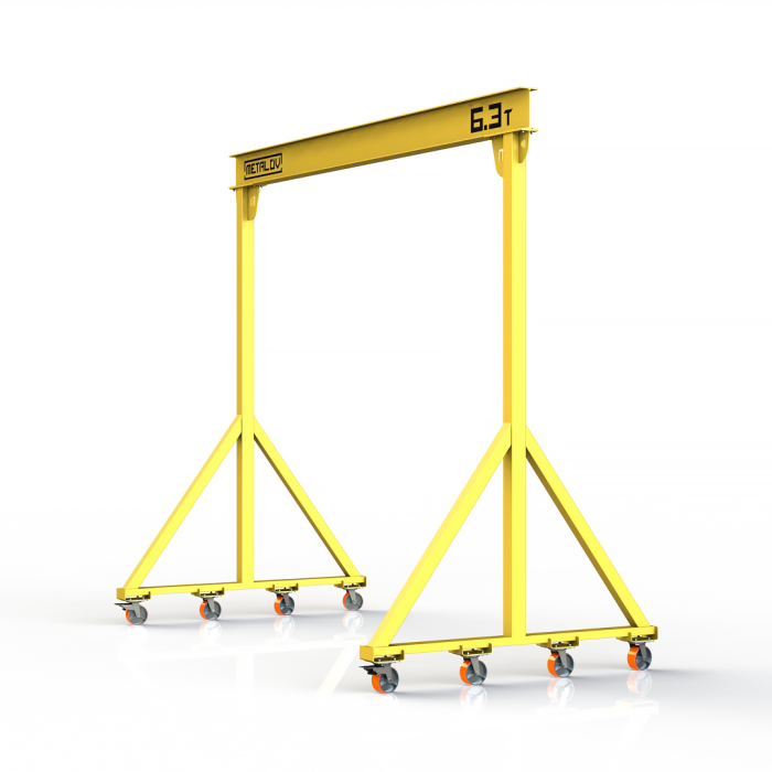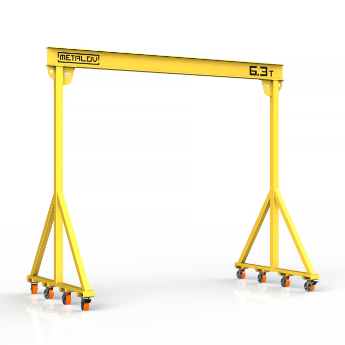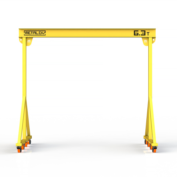 Мини-кран козловой мобильный (МПУ) грузоподъемностью до 6,3 тонн, с высотой до балки 3 метра и шириной пролета 2 метра, это подъемное устройство, предназначенное для подъема и перемещения различных грузов на небольшие расстояния. Кран адаптирован для складских и производственных помещений, также может быть использован и на улице.