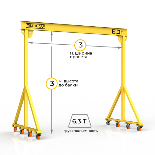 Мини-кран козловой мобильный (МПУ) грузоподъемностью до 6,3 тонн, с высотой до балки 3 метра и шириной пролета 3 метра, это подъемное устройство, предназначенное для подъема и перемещения различных грузов на небольшие расстояния. Кран адаптирован для складских и производственных помещений, также может быть использован и на улице.